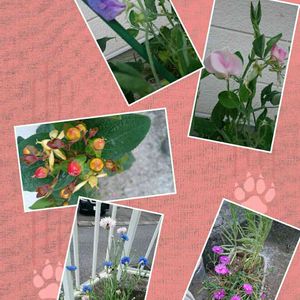 今晩は😊 2枚目連投 左上から、スイートピー 紫色、ピンク色🎶 右下はマツバギク 左下はヤグルマギク 白、青、ピンク色? 左中挿し木からのヒペリカムは枝が次々と伸びて花❀実と長く楽しませてくれてる スイートピーの鞘はいつ採取?茶色になるまで待つのかしら🤔