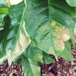 コーヒーの木の葉っぱに写真の様なものができてました。葉焼けかな~~😑😑皆さん教えてください‼️