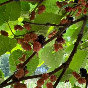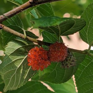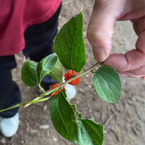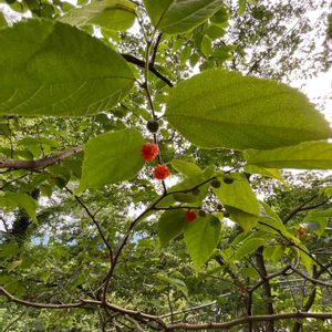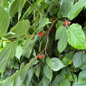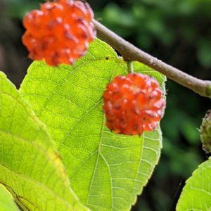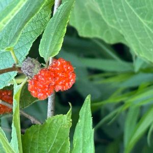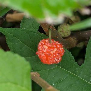 丘陵地の公園の近くに🌿🌿 赤い実を沢山つけた木がありました。これは、コウゾですね❤️ かなり大粒です。 ひとつ食べてみました。 甘くてねっとりしています。 実がなるのは、ヒメコウゾみたいです。 クワ科カジノキ属 樹皮の繊維が強く和紙になる、