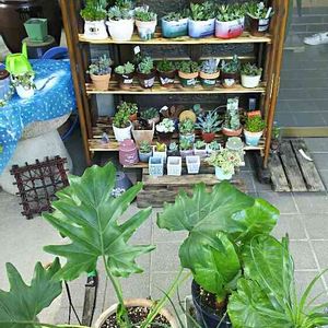 多肉から離れ💦 セローム💚 クズワイモ💚 ノリナ(とっくりラン)💚 の日光浴中☀❗ 後ろの多肉棚は日陰に設置 蒸れ、葉焼け防止中😅