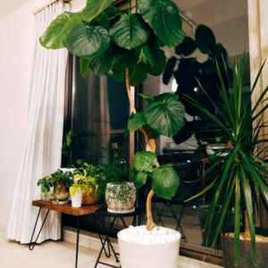 フィカス・ウンベラータ🌴 観葉植物にハマるきっかけになった子です。 我が家に来て2年、だいぶ背が高くなりました✨ 下の方の枝分かれしたところがあんまり伸びてないので、来年は思いきって剪定して枝を作りにいこうかと構想中。