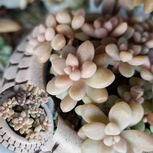 秋麗ちゃんが肌色になり可愛いです。 竹鉢に秋麗とブロンズ姫、姫秋麗をメインに寄植えしていました。2年過ぎました。