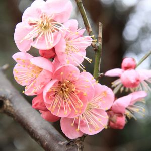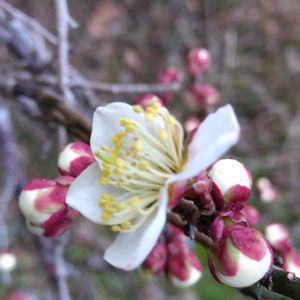 桃色の梅の花 このこのお名前は ˚*.꒰ 紅筆 ꒱.*˚ 蕾の時は丸くなく毛筆(紅筆)のように尖っている 花びらの先も尖ってる 2月中旬から咲き始める遅咲きさんです 二枚目 花びら丸い、色も紅色 紅筆さんなのかな ちょっとビミョー💦💦 でもきっとそう