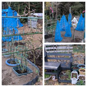 地植えの木立やポール仕立ては竹の反発力を利用して防風ネットでくるんでます。1メートル位の積雪があっても竹は折れずにスペースを守ります。 鉢植えバラはいつものように土に埋めて、板で雪囲い。鉢植えつるバラは誘引してそのまま埋めてます。地植えのビバリーは太い主枝毎に竹支柱を立てて補強してます。、や