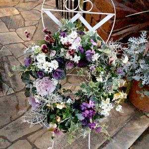今年もリース型に寄せ植えしました💜 ピンク〜パープルグラデーションのイメージで💖💜💖 ビオラ アリッサム マーブルストロベリー オレガノ ポリゴナム
