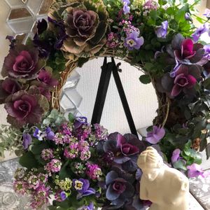 ずっとやってみたかった葉牡丹とビオラのギャザリングリースを作りました😊 なるべくラブリーに💕と色選びも慎重に… 玄関に飾ります‼️