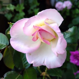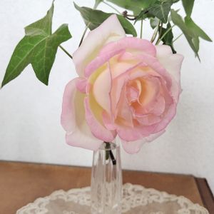 薔薇🌹が大好きなのに育てる自信がなくて花友さんからもらった挿し木の一鉢がやっと咲きました💞 咲ききる前に風で周りの花びらが広がっていますが、縁のほんのりピンクにうっとり✨💗✨ 皆さんの豪華な薔薇🌹🌹🌹のpicを見せていただいて癒やされて満足してます🥰