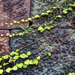 お堀の石垣に ツタとシダ 右肩上がりのラインが気になった