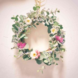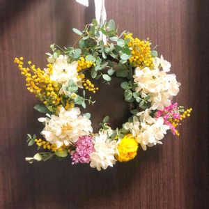 赤葉のミモザを購入したので普通のミモザと混合してリースを作成😊 リース作り初めてにしては満足なできです😍💕