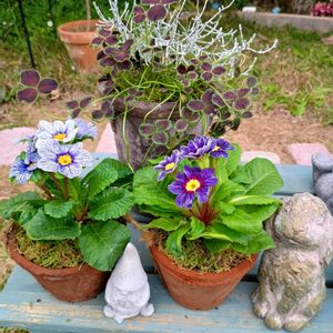 こんばんは☀️ 多分植えてから1カ月くらい経ってます寄せ植えです ゲブラビオラ ミステリアスシリーズ Mariaとプリムラジュリアン ゼブラ、コクリュウを植えました♪ 寄せ植えして一回お花が休んでからなかなか咲かなくて、やっと咲いてきました ③そしたらMariaが紫濃いめになってきまして😂 ④11/7買った頃の写真 もうちょっと水色だったのに‥ うーんイメージとちょい違うすごく地味な感じの寄せ植えになってしまいました😅 ②ゼブラさん久しぶりに買いましたがやっぱり可愛いです🦓