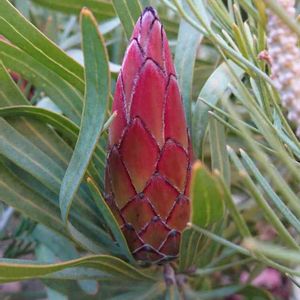最近のスマホはなんでも細長く見えるように写ってしまうので伝わりにくいですが、まぁる~い感じに開いてきています。他のどのプロテアとも違う咲き方するようで開花始めに気付きませんでした。 先端の黒いのが出始めて球体っぽく開いていくようです。完全開花も丸っぽくボリュームある感じに開くのでとてもかわいいのです。
