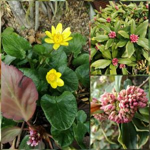←リュウキンカ🌼 ヒマラヤユキノシタ🌼 咲き始めました😍 ↗↘沈丁花の蕾🌼 同じお庭に咲いてます😊