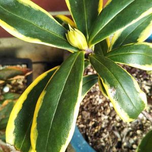 「斑入り沈丁花」 香りシリーズの新入りです。 10月2日から、香りシリーズに仲間入りしました。 赤い花が咲く苗です。 まだまだ小さいので、大きく育ってくれるのを見守って行きます。