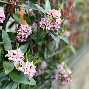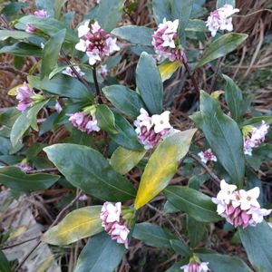 ジンチョウゲ(沈丁花) 濃いピンクの花序からは、よい香りが漂っています😊 香木の沈香(ジンコウ)の香りと丁子(クロープ)の香りを合わせた様な香木から名がつきました😃