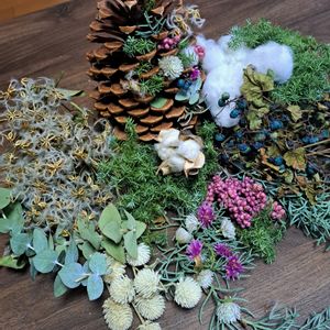 大きな松ぼっくりのクリスマスツリー 今日は雨で、お庭仕事ができないので、これにチャレンジしてみようかな? ペッパーベリー以外は、いただきものや、お庭のもの。左の白いふわふわは、仙人草の種でリースの先生にいただいたもの。仙人のひげみたいなので、この名前が付いたそうです。