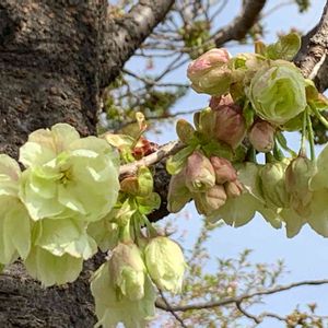 桜🌸の種類 里桜 お花が綻びていました。 青い空に映えます😊