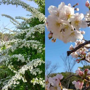 R4.4.4 昨日は曇りで風も冷たかったけど今日は青空~☀️ 桜の下で棒状になってるのは おそらく…紫陽花? さくら 満開満開🌸🌸