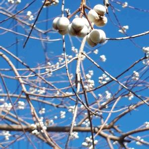 これは実? 鳥が食べにきていました。 街路樹に花が咲いたみたい。