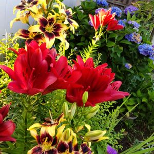 今、庭に咲いているお花達 ①ユリ、ピエトン、スカシユリ ②ストケシア ③冬越ししたベコニア ④🐱みーちゃんオモチャを前にして遊んでくれるのを待っています。 みんな私の癒しです❤️🎶