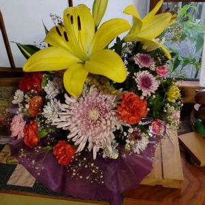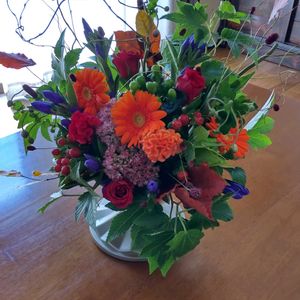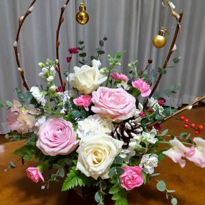 フラワーアレンジメント 今日の作品です。 早速みーちゃんのチェックが入りました😺💦😂