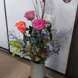 ①今日はフラワーアレンジメントの日でした。 ②昨年京成バラ園で買ったミニ薔薇 ③④庭にこぼれ種から出てきた赤い撫子。 ⑤ぎょりゅぅばいとホウチャクソウを花瓶に刺したら早速みーちゃんがチェックしています😺