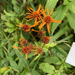 コウリンカ(紅輪花) キク科 オレンジ色が緑の草原で目立ちます🧡 赤みを帯びた花びらが車輪のように見えることからの名前で、標高の高いやや湿った草原に生える多年草。 花弁はばんざーい🙌して咲くのに後になぜ全員が手を下ろすのか?不思議🤭