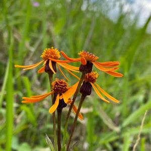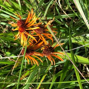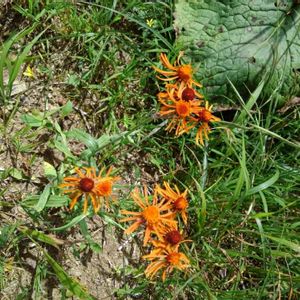 コウリンカ。(紅輪花) なんだー、けっこう良さそうな花なのに全部終わりかけてるなぁ、色も変色しちゃって!…と思いましたら、こういう花のようです😁 今咲いてる花の予備知識ゼロで大菩薩峠に出かけました。鹿の食害が激しく、見られるのは笹と、鹿が嫌って食べないものばかり?それでもいくつかは見つけられました。 キク科コウリンカ属の多年草。 花期7-9月