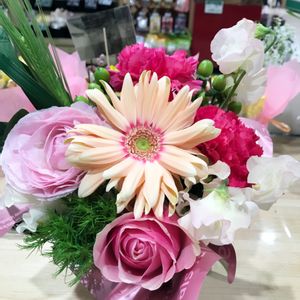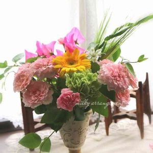 二種類だけだけど、葉物がない中で春の花を入れて春っぽく作ってみたアレンジ🌸.* 最近アレンジがスランプ気味です…💦 そして花の入荷が少ない(´•ω•`) 大輪ガーベラがかわいくてお気に入り〜!