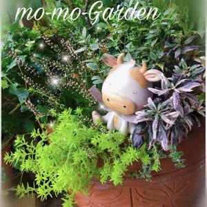お気に入りの寄せ植えの中に もーもーちゃん💖 春になっると緑も元気ですね💛 お庭の一番大きな鉢です🪴