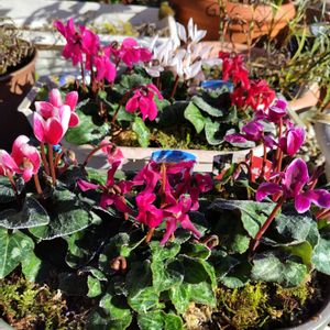 霜が降りた朝🤍❄️🤍 ①ガーデンシクラメン❇️💗🤍❤️🩷❇️ ②葉牡丹💚💜💗 ③スジナシえんどう❇️💟❇️