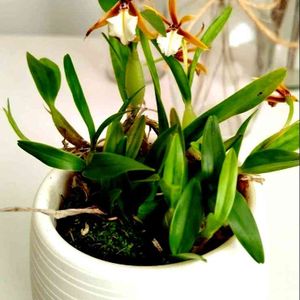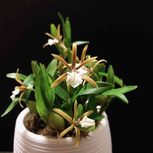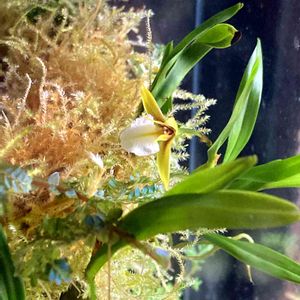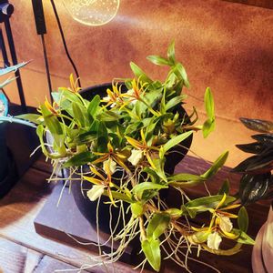 蘭を育ててみたくて、ポリブルボンを購入しました🪴小さい花とバルブがかわいい。 とりあえずしばらくはこのままで、後々板に着生させるか考えます。