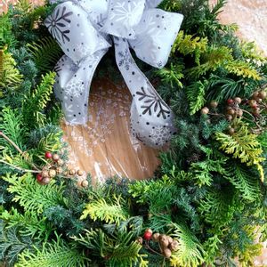 大切なお友だちからステキなクリスマスのリースをいただきました✨ 柔らかなヒバの葉っぱはいつまでも触っていたいくらいです🌿 どこかで見つけたらしい実がプスプスっと挿してあって、これまた愛らしい💖