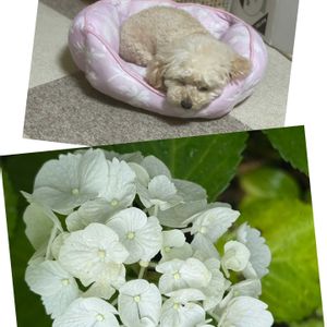 良いお天気☀️ ワンワン祭り忘れそうでした💦 1枚目〜道路側から見上げたカシワバアジサイ🌿 来週には咲くかな❣️ 3枚目はフェリシア🌹 アーチ仕立てではないけれど何となくそれっぽい😅 2.4.5はわたふわ達💕