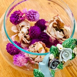 今朝の1枚 ドライフラワー センニチコウ バラ🌹 カットしたセンニチコウ、バラをドライに☺️ ガラス瓶はポプリを入れたりする物で、蓋は真ん中が開いてる。 バラの模様が入っていて、だいぶ昔からあるんだよなぁ。 もしかしたら、何十年物かも😅 100円ショップのアロマオイルを数滴かけたので、お部屋で微かな香りが💜💗❤️