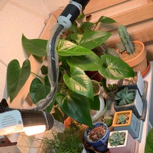 おはようございます🌤 今日は朝から部屋の掃除、片付け頑張ってやりました( -.-) =зフウー というのもお昼頃に関東から次女が帰省してくるので☺️ やっと綺麗に掃除した後に、さあ今日のGS picをと干したソファカバーを巡った瞬間...やっちまいました😭 1つの多肉鉢が落下(Θ_Θ;)しかも窓の桟から部屋にまで土が散乱してせっかく掃除したのに〜(><) ドッと疲れました😓 気を取り直して🤳✨ 先日植物用LEDを購入してみました💡 室内組で成長の悪い子や外で蒸れたり枯れかけてる子達を元気に回復できるかなと(_ _。) ちなみに写っていませんが左側に置いてあるウンベラータの葉っぱが少し焼けました😵 ライトが近すぎたみたい💦