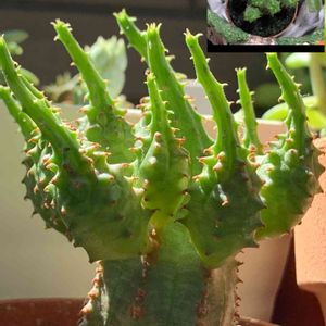 こんにちは😊☀️ 今朝は早起きして多肉巡りしようと思ったけどまた寝過ごしました😓 洗濯掃除したらこんな時間です😅💦 これ何の多肉かわかりますか❓ 1月頃ユーフォルビア グロボーサの名前で購入しましたが類似が多いみたいなので半信半疑です😠 そして今ではこの姿❗️これ徒長?といっていいのかわかりませんが放置してたら先がビヨーンと伸びてました😆💦 お水も切っていてカラッカラな土、 朝晩涼しくなってきたから夕方にお水あげてみようかな😌