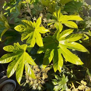 ヤツデが巨大化しております 細身のヤツデが2本と大型ギボウシ、柏葉アジサイ、ツワブキ他、みたいな緑のコンテナでした コンテナ自体の老朽化により入れ替えてヤツデを少々深植えにしたからか7本8本の株立ちになり💦 まさにグリーンモンスター🌳🦖 #これでも葉刈りと半分抜きました #奥のプランターはW500 この時期入れ替わる古葉も綺麗ね🍁✨ #バナナ🍌色