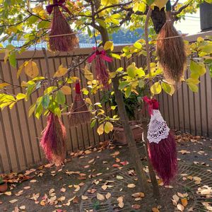 コキアホウキがなる木😊❣️ 【最終回コキアのホウキ作り🧹】 本日は11名の方に参加して頂きコキアのホウキを作りました。8年前に苗を購入してからタネを取り続け、その後一度も苗を購入することなく継続していくことができています👏和ぼうき、洋ぼうき、長いホウキ、ミニホウキ。それぞれ好みのホウキを作り、コキアがなる木が出来ました〜😊💓 ○和ボウキの割り箸で止めてあるのは しばらく形を落ち着かせるためです。まだ作りかけです。