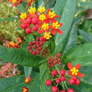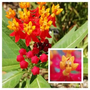 アスクレピアス (トウワタ) 初夏から秋にかけて、まっすぐ伸びた茎に 向かい合って生えた細長い葉の上に鮮やか な朱赤の蕾が開くと、オレンジと黄色のツ ートンカラーの花が次々と咲き、房になり ます⭐︎ お散歩で見つけた可愛いお花です❤️ 花言葉 「健康な体」「小さな恋」