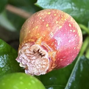 イヌビワでしょうか? 花嚢が大きく開いていて とっても可愛いです 見慣れたイヌビワの実と違ってたから 他の種類? と迷いました 海岸に自生していました 名前を教えてください よろしくお願いします イヌビワと教えていただきました ありがとうございます♡
