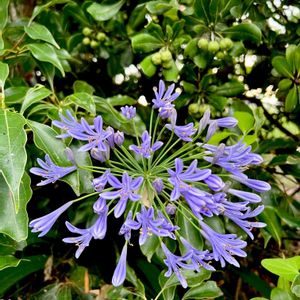 今日のお花💠アガパンサス 別名紫君子蘭、アフリカンリリー ヒガンバナ科、耐寒性やや強い、耐暑性強い、球根か苗(種だと5年で開花) 駐車場のグリーン、トベラでしょうか 中から一輪だけぐーんと顔出しています こんな所にいたんだね💜✨💜✨ 我が家にも出会いありますように💕🤗