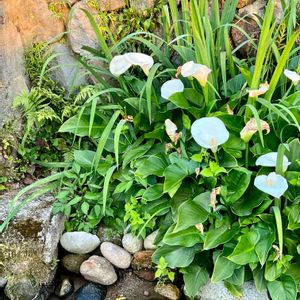 今日のお花💠カラー サトイモ科、多年草、球根 多湿を好む湿地性と、乾燥を好む畑地性カラーの2タイプあり、性質に合わせて育て方を変えるとあり、不思議だったカラーのある風景の2面性に納得でした😲 水辺に花咲く風景に💙🤍💚✨ 石垣の風景に心和みルン⋆⸜(* ॑꒳ ॑* )⸝ルン 6月9日夕暮れ散歩道にて 🏷白い恋人達 🏷水辺の風景に初参加します🤗