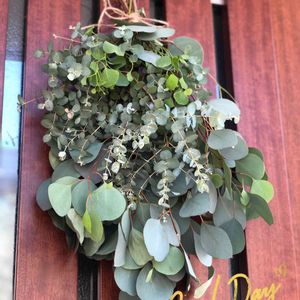 🌿ユーカリのスワッグ🌿 お向かいさんが剪定したユーカリポポラスを下さったので、我が家のグニーと合わせてシンプルなスワッグを作り、お向かいさんの了承を得て、以前から素敵💖と褒めて下さってた、これまたご近所にプレゼント💐 グリーンでご近所さんに繋がりが😉 ユーカリだけのスワッグもシンプルで涼しげで気に入っています🌿