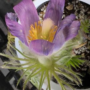 2月末日、下野道の駅で見かけた、うなだれた頭を、一生懸命にもたげようとする、いじらしい「オキナグサ」の妖精‼️ 顔を覗き込んで、ごめんね‼️