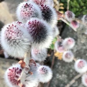 3月4日、さくら市付近の農家の庭先で見つけた、小さな赤い花🌸🌺に、変色し始めた可愛らしい「ネコヤナギ」の花🌸🌺が、西陽にあたり、輝いていました‼️