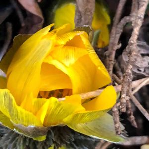 2月上旬、石井町の農家の庭で、今年初めて見つけた、ほころびかけの「福寿草」の黄色いつぼみ