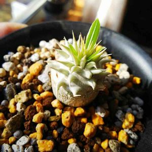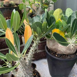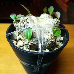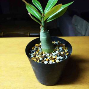 パキポディウム ブレビカウレ (恵比寿笑い) 今年3月に未発根の現地球として購入。 あれから7ヶ月、夏には葉っぱが生えてきた。 10月になってから気温が下がって、何枚か紅葉してきたので今は温室管理。 画像は9月の物でした。