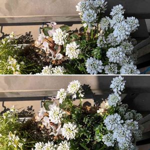 イベリス ブライダルブーケ 花が終盤になりかけの花茎を少し整理、 新たな花芽が出てくるといいな。 上:整理前 下:整理後