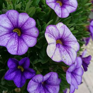 上⤴︎カリブラコア(ふわリッチラベンダー) ペチュニアとかドーム形に出来ない下手っぴな私には自然にドーム形に広がるのは有難い🙏💜 下⤵︎ ︎バーディーシクラメン コウム(スノープリンセス) 日陰で育てる耐寒性の強い野生種のシクラメンです💜 お花は原種みたいにクルクルなりませんでした😳💦