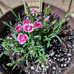 おはようございます☀️ サントリーミーテ、ミステリーピンク。 1ヶ月くらい前にお迎えしましたが、 なかなかもりもりにならず、しびれを切らしたので投稿します。 よくわからないで買ったけど、ナデシコなんですね。 涼しくなったら、たくさん咲いてくれるだろうか。